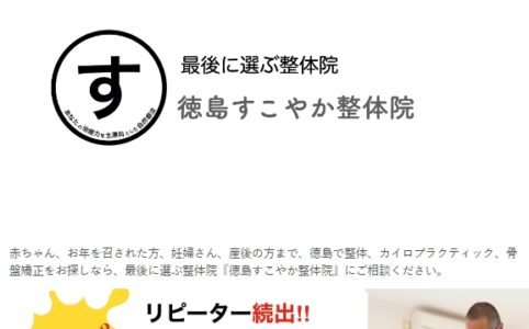 徳島すこやか整体院 【徳島県徳島市上助任町三本松375-5-1F】 赤ちゃん、お年を召された方、妊婦さん、産後の方まで、徳島で整体、カイロプラクティック、骨盤矯正をお探しなら、最後に選ぶ整体院『徳島すこやか整体院』にご相談ください。