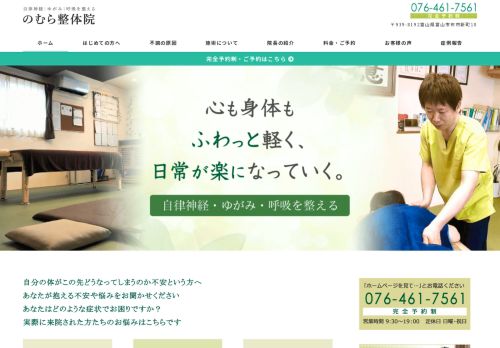 【富山県富山市布市新町10】 のむら整体院|富山市にある「自律神経・ゆがみ・呼吸」を整える整体院 慢性化した腰痛や肩こり、めまいや耳鳴りなどの自律神経症状、スポーツ選手の疲労回復、産前産後のケア、子どものアレルギーなど、...