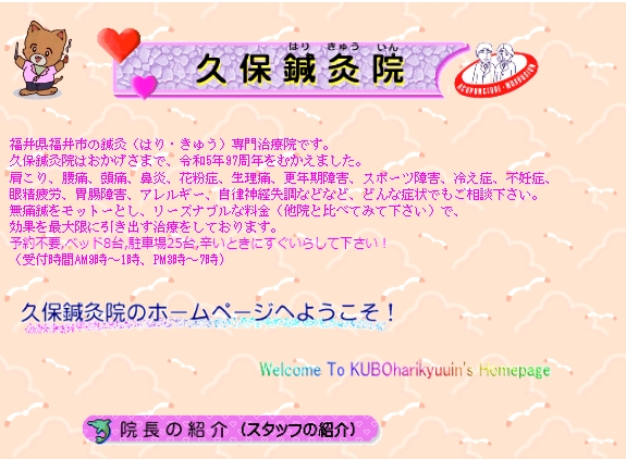 【福井県福井市みのり2-9-19】福井県福井市の鍼灸(はり・きゅう)専門治療院です。 久保鍼灸院はおかげさまで、令和5年97周年をむかえました。 肩こり、腰痛、頭痛、鼻炎、花粉症、生理痛、更年期障害、スポーツ障害、冷え症、不妊症、 眼精疲労、胃腸障害、アレルギー、自律神経失調などなど、どんな症状でもご相談下さい。 無痛鍼をモットーとし、リーズナブルな料金(他院と比べてみて下さい)で、 効果を最大限に引き出す治療をしております。 予約不要,ベッド8台,駐車場25台,辛いときにすぐいらして下さい! (受付時間AM9時~1時、PM3時~7時)