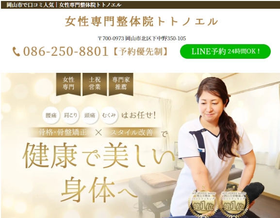 岡山市で口コミ人気の女性専門整体院トトノエルです。腰痛・肩こり・頭痛・むくみはお任せください!骨格・骨盤矯正×スタイル改善で健康で美しい身体へ導きます。女性スタッフ対応、キッズスペースあり、駐車場6台完備です。是非お気軽にお問い合わせください。