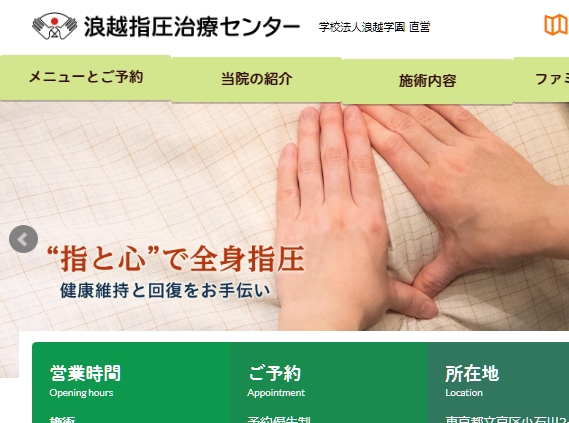 【東京都文京区小石川2-15-6】 浪越指圧治療センターは、現在の指圧の基盤を築き世に広めた、浪越徳治郎が設立した指圧治療院です。 浪越学園で治療技術を学び、国家資格を持つスタッフが在籍。体の痛み、コリ、ストレスによる身体の不調、むくみ、更年期における不定愁訴など、種々の症状に丁寧に対応します。