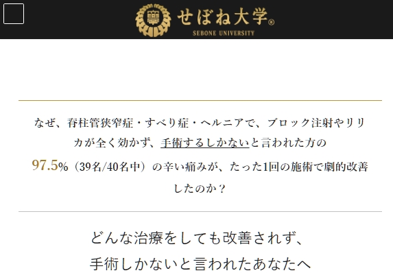 【東京都港区南麻布4-5-48 フォーサイト南麻布4F】 手術せずに脊柱管狭窄症を改善する最後の治療【AKS SALON 麻布東京】 関節治療を専門とするAKA-博田法をさらに進化・改善させたAKS療法®。何か月も続く強い痛みでも、『関節』が原因なら、 たった1回の施術で2週間以内の治癒率が80%を誇ります。