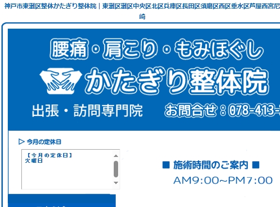 【兵庫県神戸市東灘区森北町1-5-11-2F】 神戸市東灘区かたぎり整体院。出張・訪問施術専門