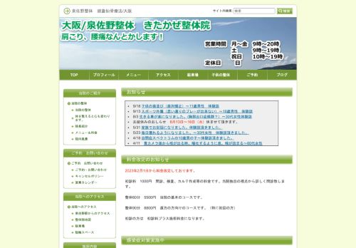 【大阪府泉佐野市】大阪/泉南/泉佐野のきたかぜ整体院です。泉佐野駅からすぐです。駐車場2台あります。 当院の整体は中国整体、カイロプラクティック、オステオパシー、(頭蓋仙骨療法、内臓整体、カウンターストレイン)が含まれています。 手技が豊富ですので、肩こり、腰痛、頭痛、自律神経いった様々な症状に対応できます。 体を整えて心も楽になる整体院です。