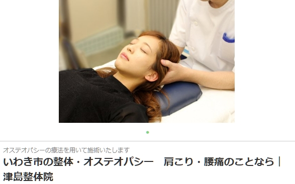 【福島県いわき市】いわき市平の村松病院さま向かいにある津島整体院です。 下記症状がある方、ぜひ当院にお越し下さい。 ・頭痛・肩こり・腰痛・ぎっくり腰・五十肩・膝痛・坐骨神経痛・内臓機能障害・自律神経の異常など ・日常何気なく体調がすぐれない方 これらのことに対してオステオパシーの療法を用いて施術をしていきます。 ●直接法 ●間接法 ●内臓マニピレーション ●ゼロバランシング ●頭蓋骨療法